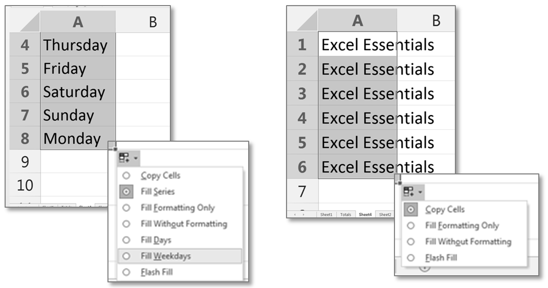 Visible when mouse is positioned over the bottom right corner of a selected cell(s). Click and drag to ‘fill’ the adjacent cells.
